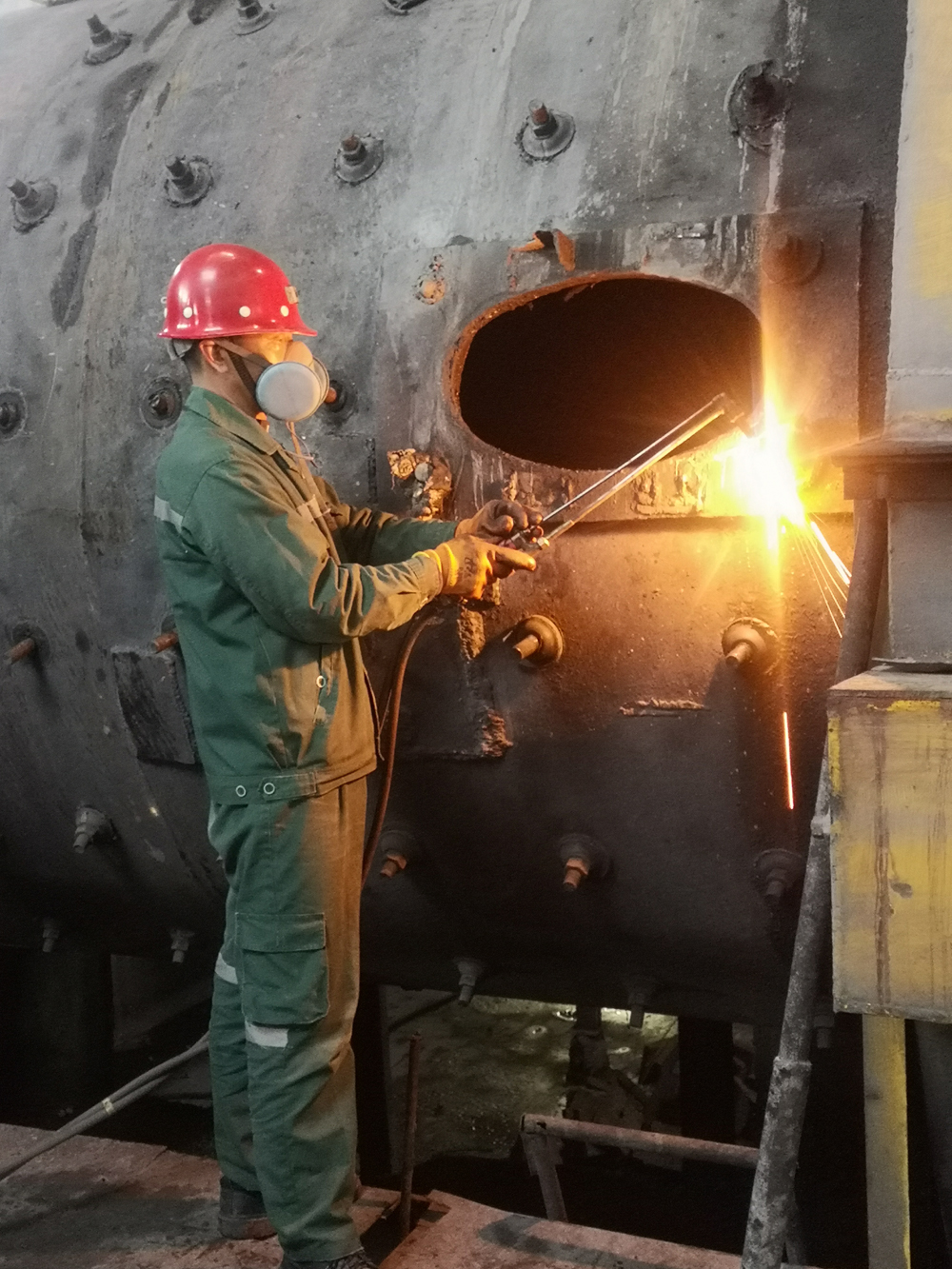 4月6日上午8時,按照計劃安排球磨機鋼球已經(jīng)全部倒出,白班進行舊襯板拆除工作。同時,磨選車間充分利用本次檢修機會,同步工藝停機,對10#球磨機鼓式給料器進行更換、11#球磨機出料端端蓋進行檢查補焊、8#球磨機小齒輪軸承座北側(cè)螺栓進行更換。